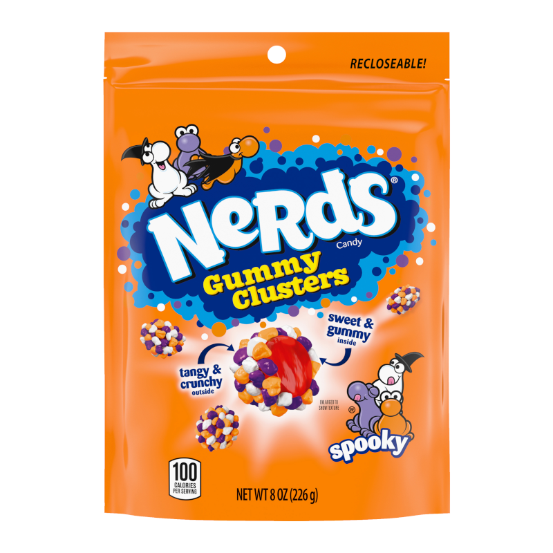 Crunchy, gummy, tangy AND spooky all in one! NERDS Spooky Gummy Clusters are fun, poppable clusters with tangy and crunchy Halloween themed NERDS surrounding a sweet and gummy center.